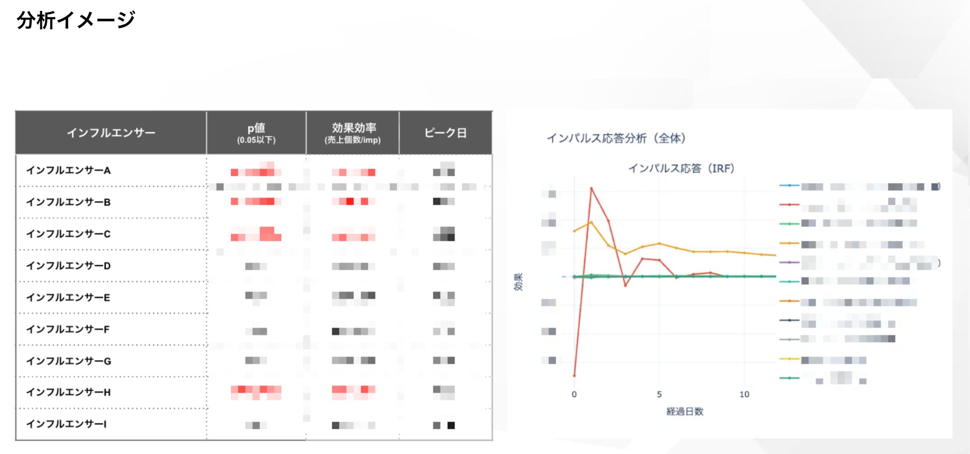 インパルス応答分析により、投稿後の売上リフトの発生タイミングと持続期間を可視化。・分析結果:投稿当日に急増する「即日効果型」と、数日後にピークを迎え1週間持続する「持続型」の2パターンを特定。