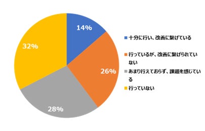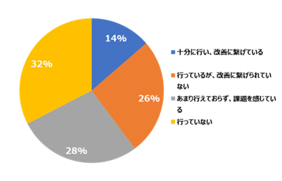 「十分に行い、改善につなげている」と回答した組織は14%でした。その内、従業員数1000名以上の組織が61%を占める結果となりました。比較的規模の大きい組織では一定程度、評価・効果測定ができていると言えます。