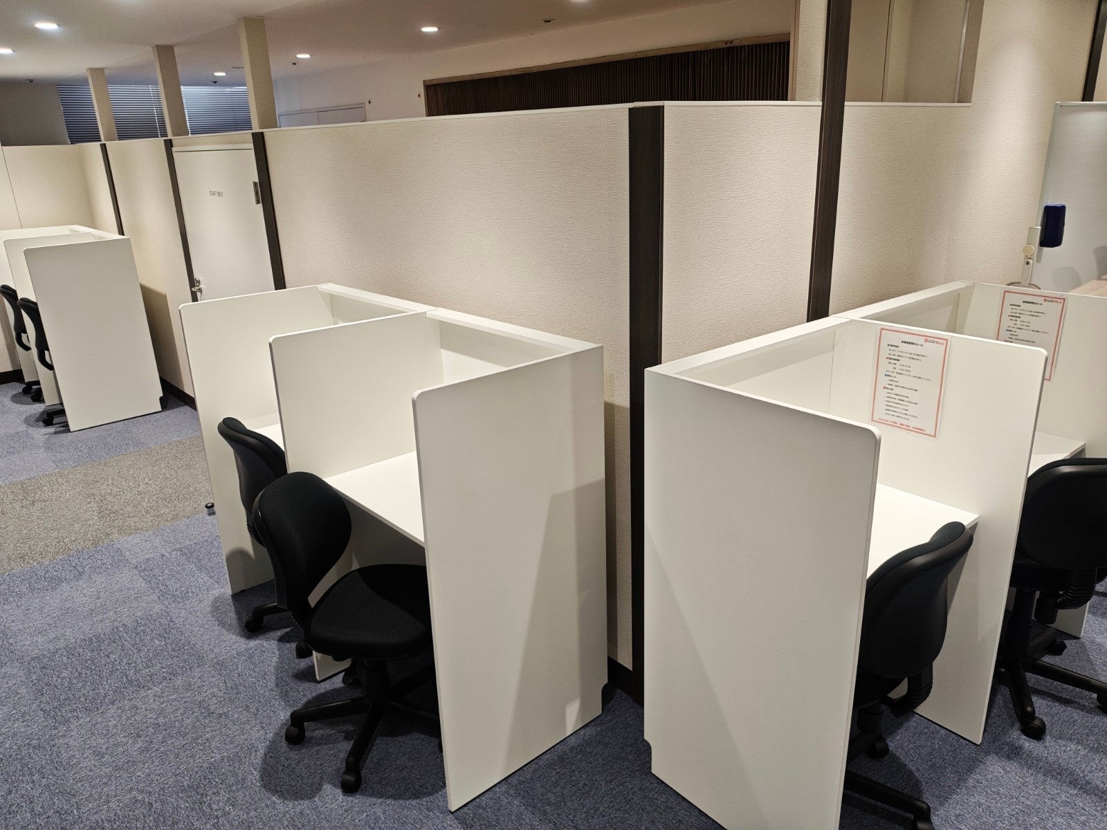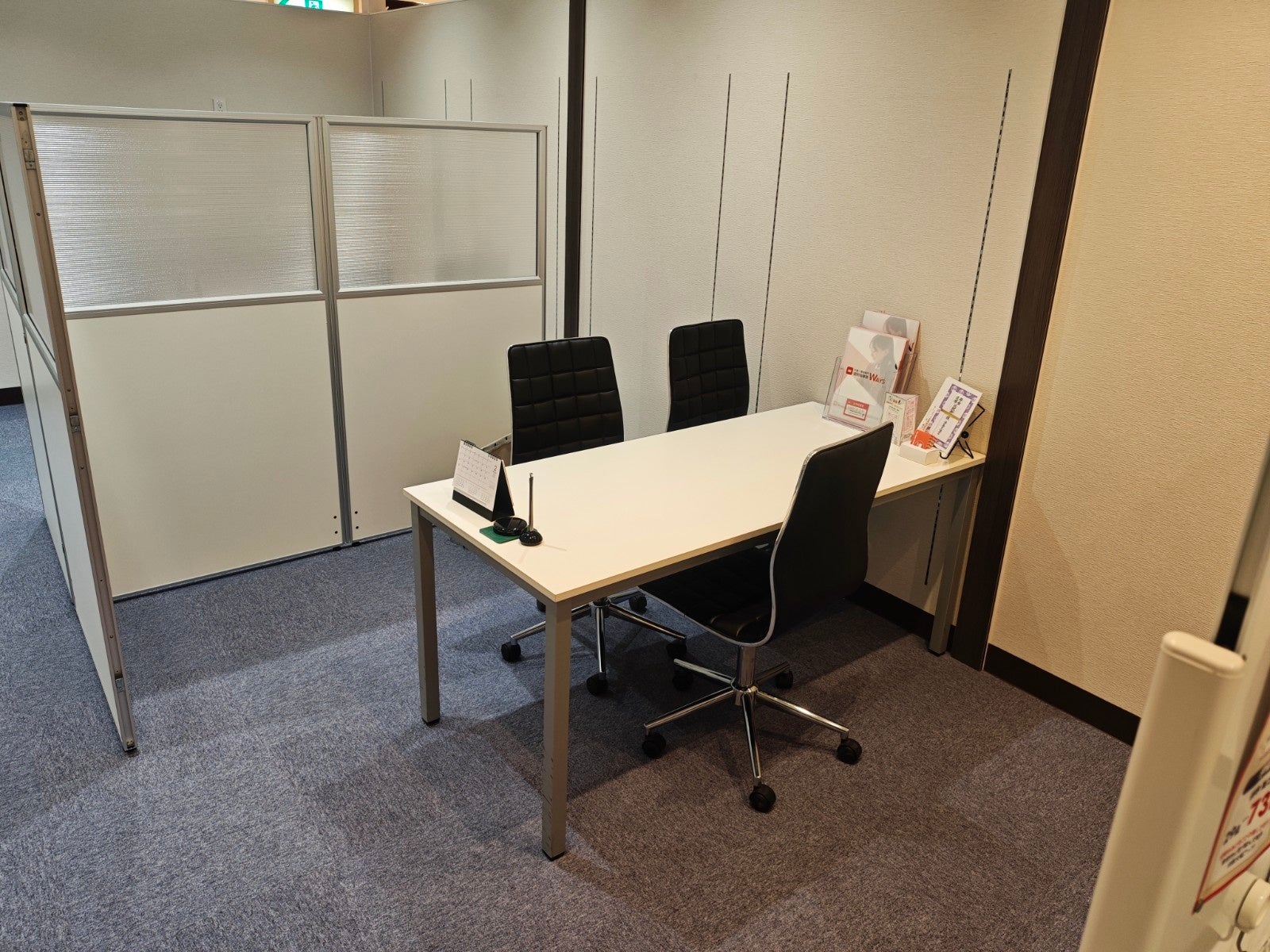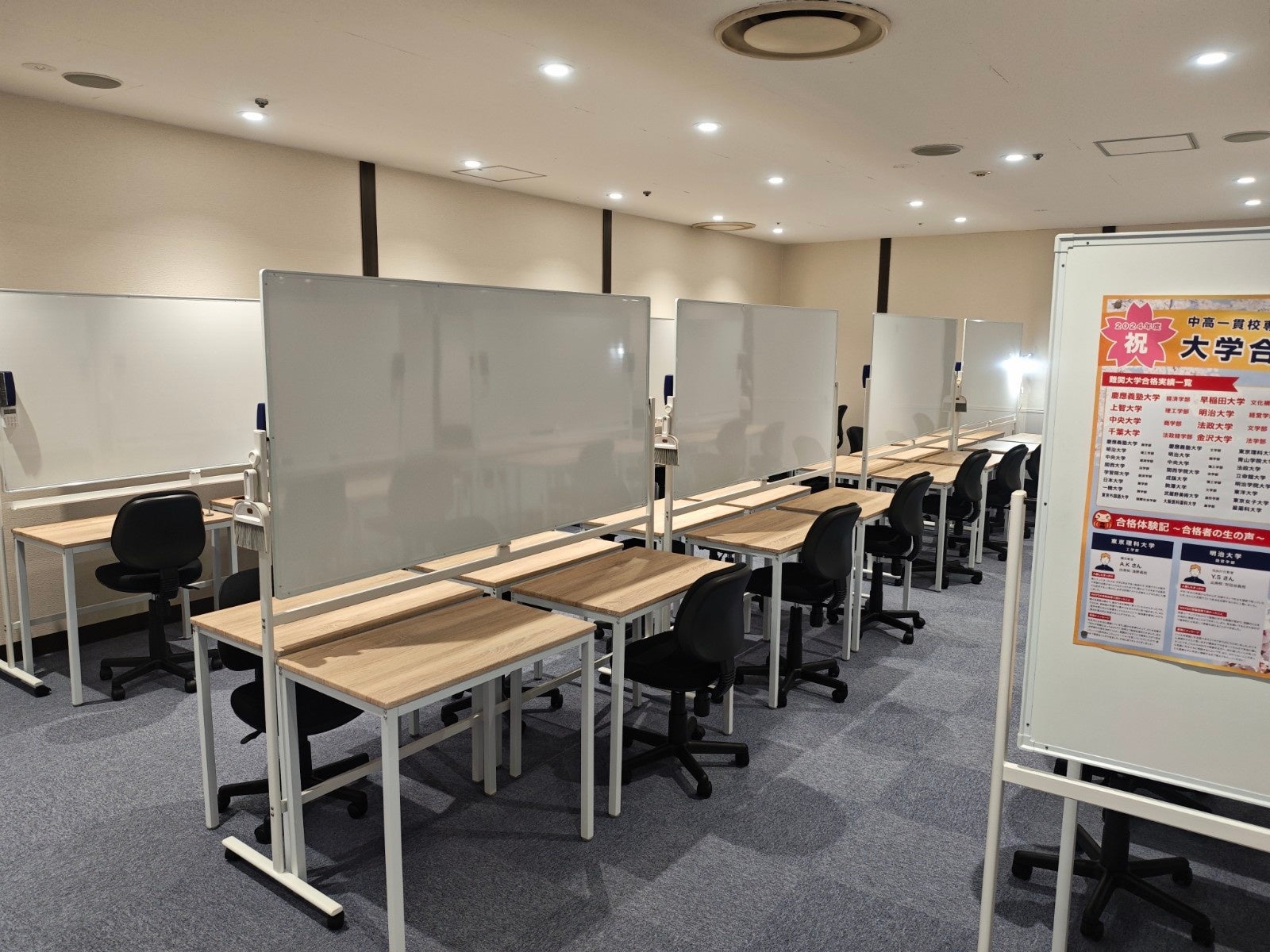 新教室では、生徒一人ひとりが十分な学習スペースを確保できるよう、広々とした空間設計を採用しています。エントランスから自習専用ブース、指導エリアへの動線も整理され、学習に没頭できる環境を構築しました。また、定期的な面談や保護者さまとの定期的な学習相談を実施するための独立した面談ブースも備えています。