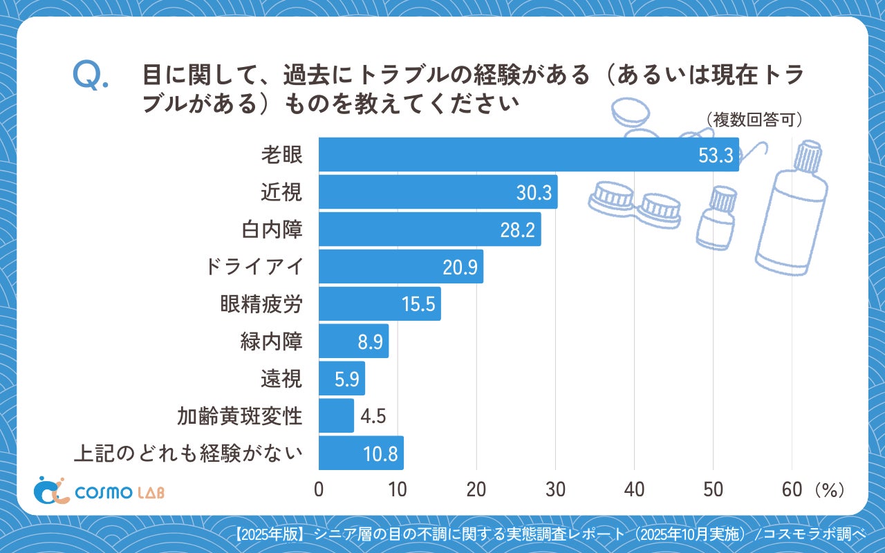 「老眼」(53.3%)が最多で、「近視」(30.3%)、「白内障」(28.2%)と続きました。
