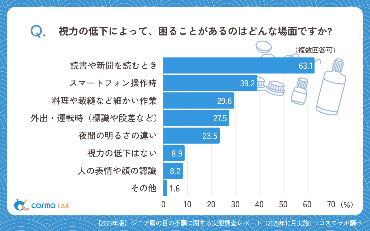 「読書や新聞を読むとき」(63.1%)が最多で、「スマートフォン操作時」(39.2%)と続きました。「外出・運転時(標識や段差など)」(27.5%)、「夜間の明るさの違い」(23.5%)も一定数存在します。