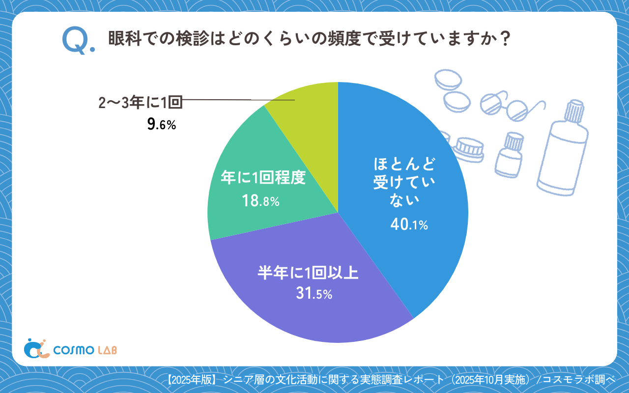 眼科検診は「ほとんど受けていない」(40.1%)が最多である一方、「半年に1回以上」(31.5%)も一定数となり、予防する層としない層が併存しています。