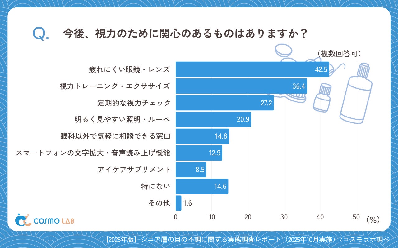 今後の関心では「疲れにくい眼鏡・レンズ」(42.5%)と「視力トレーニング・エクササイズ」(36.4%)が上位となり、即効性のある道具と、改善を目指す行動の両方が求められています。