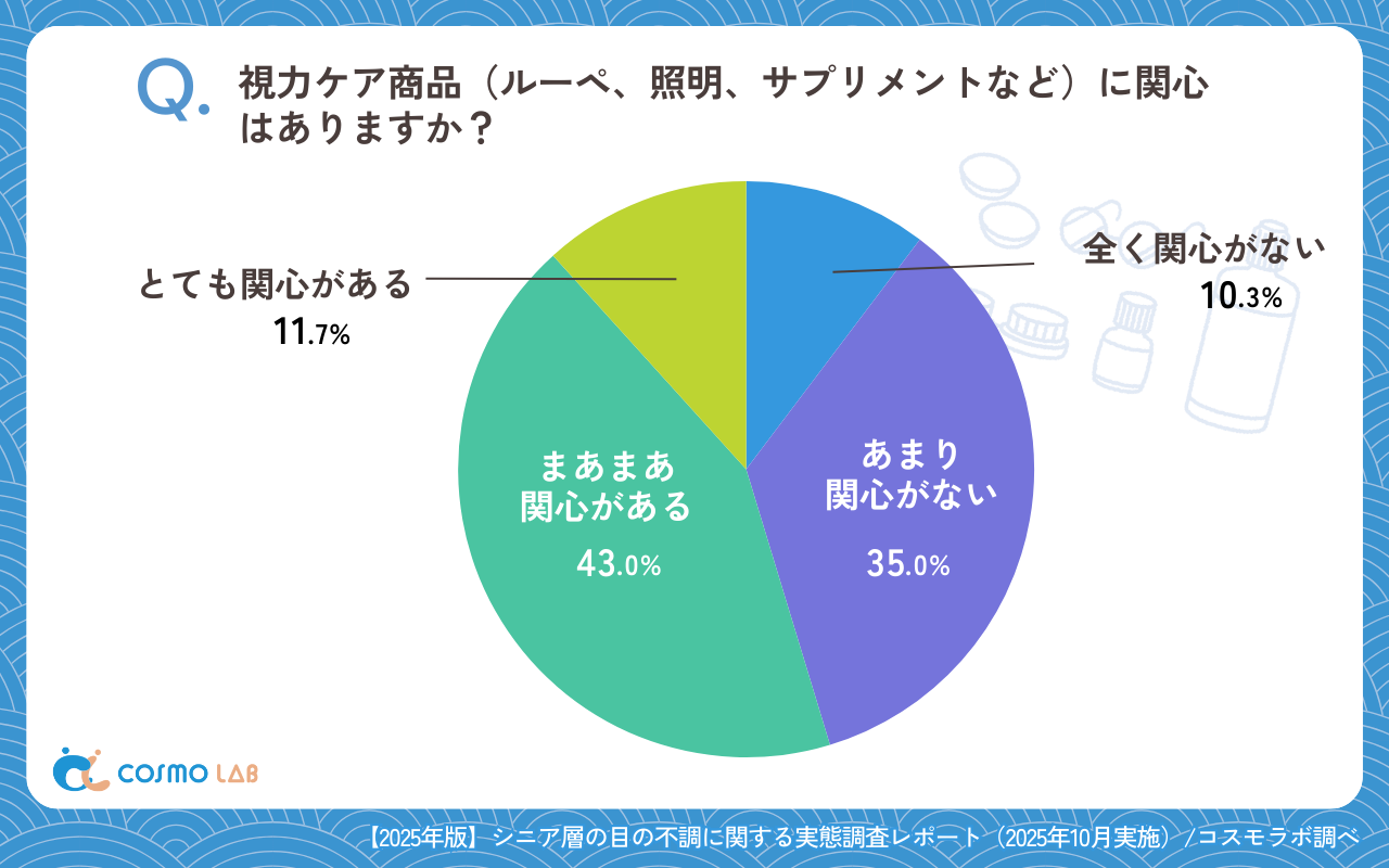 本調査から、シニアの目の不調は「生活への影響は中程度」「原因として加齢と生活要因がある」「ケアの内容は複数」という特徴を持つとわかりました。