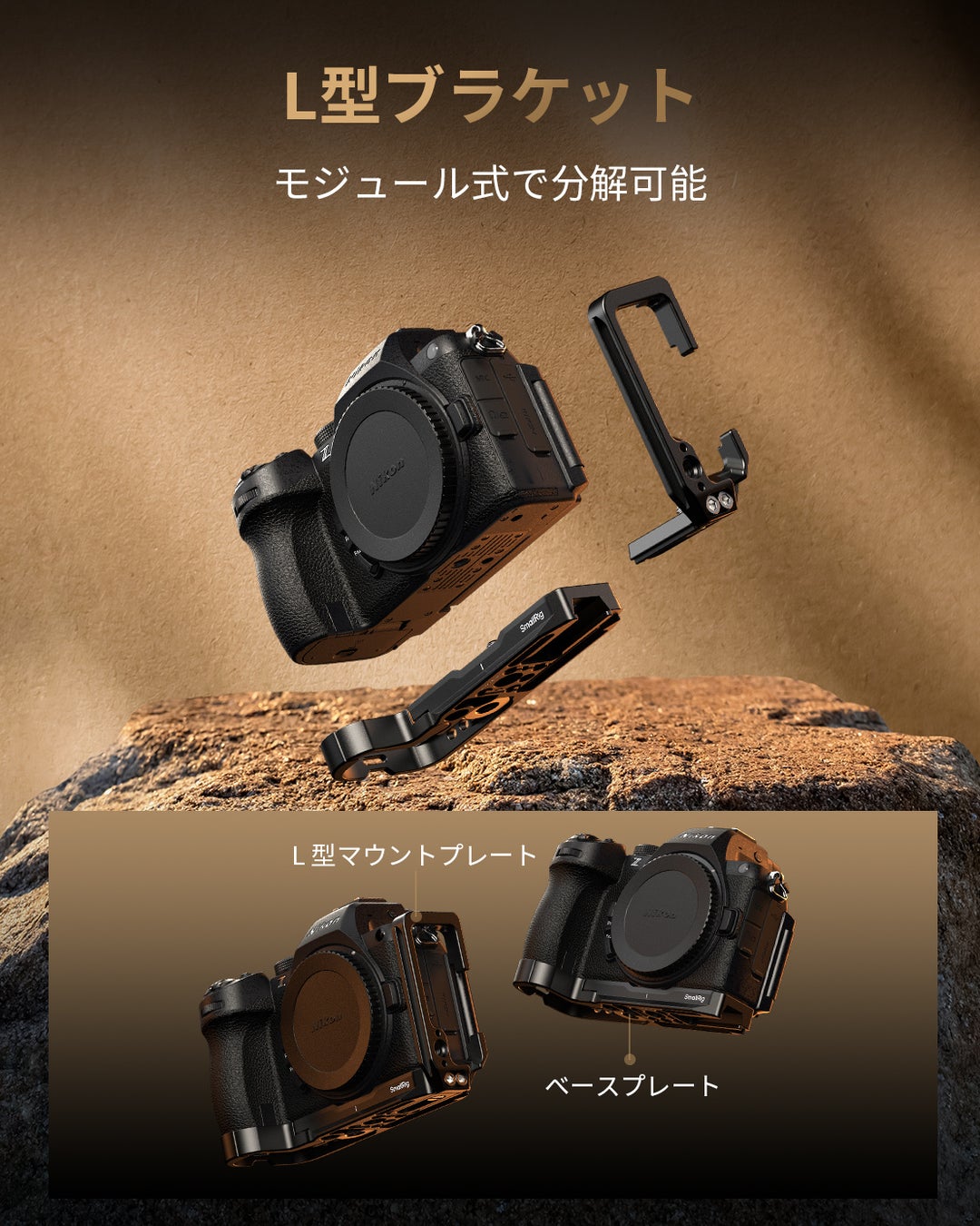 Nikon Z5II用L型ブラケットはモジュール設計を採用しており、サイドプレートを取り外してベースプレートを独立して使用することができます。