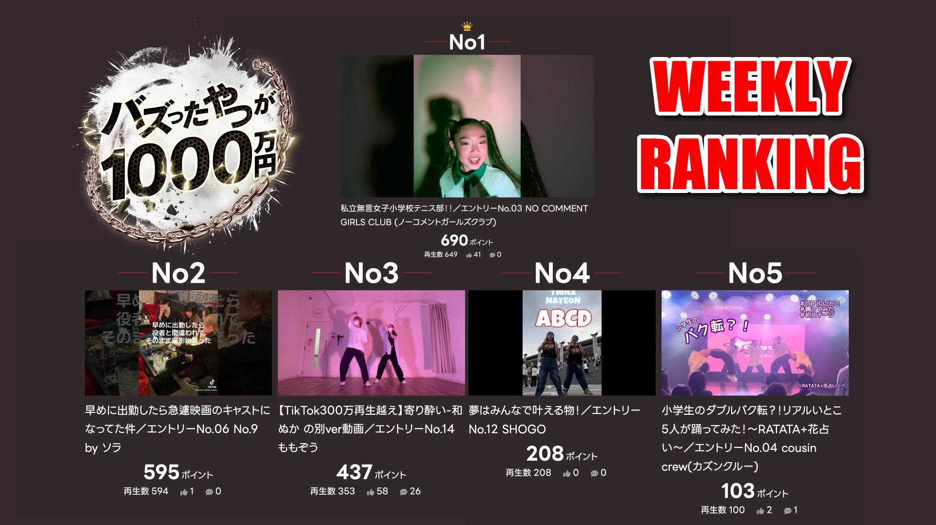 YouTubeで開催中「バズったやつが1000万円」の第一回目となる週間ランキングが発表!
