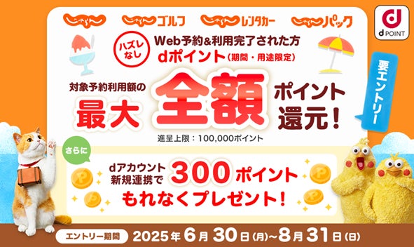株式会社NTTドコモ(以下、ドコモ)は、株式会社リクルートが提供する旅行情報サービス「じゃらんnet」において、「じゃらんnetで最大全額ポイント還元キャンペーン」(以下、本キャンペーン)を2025年6月30日(月)から2025年8月31日(日)までの期間で開催いたします。