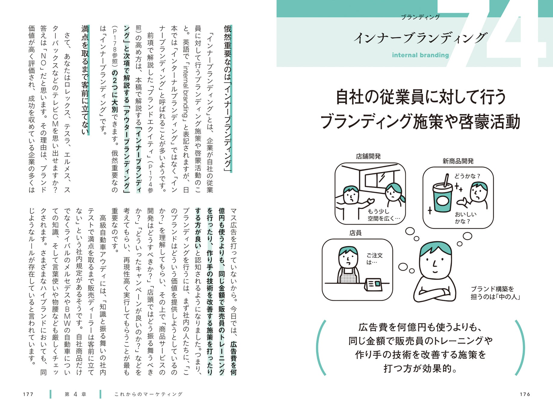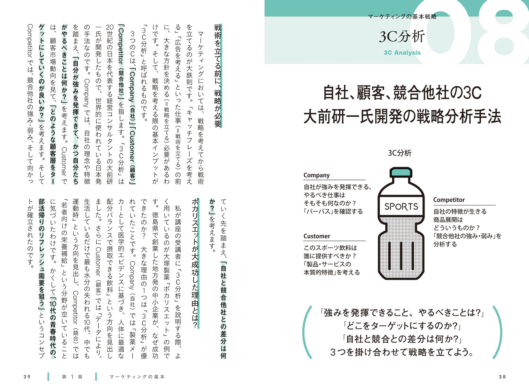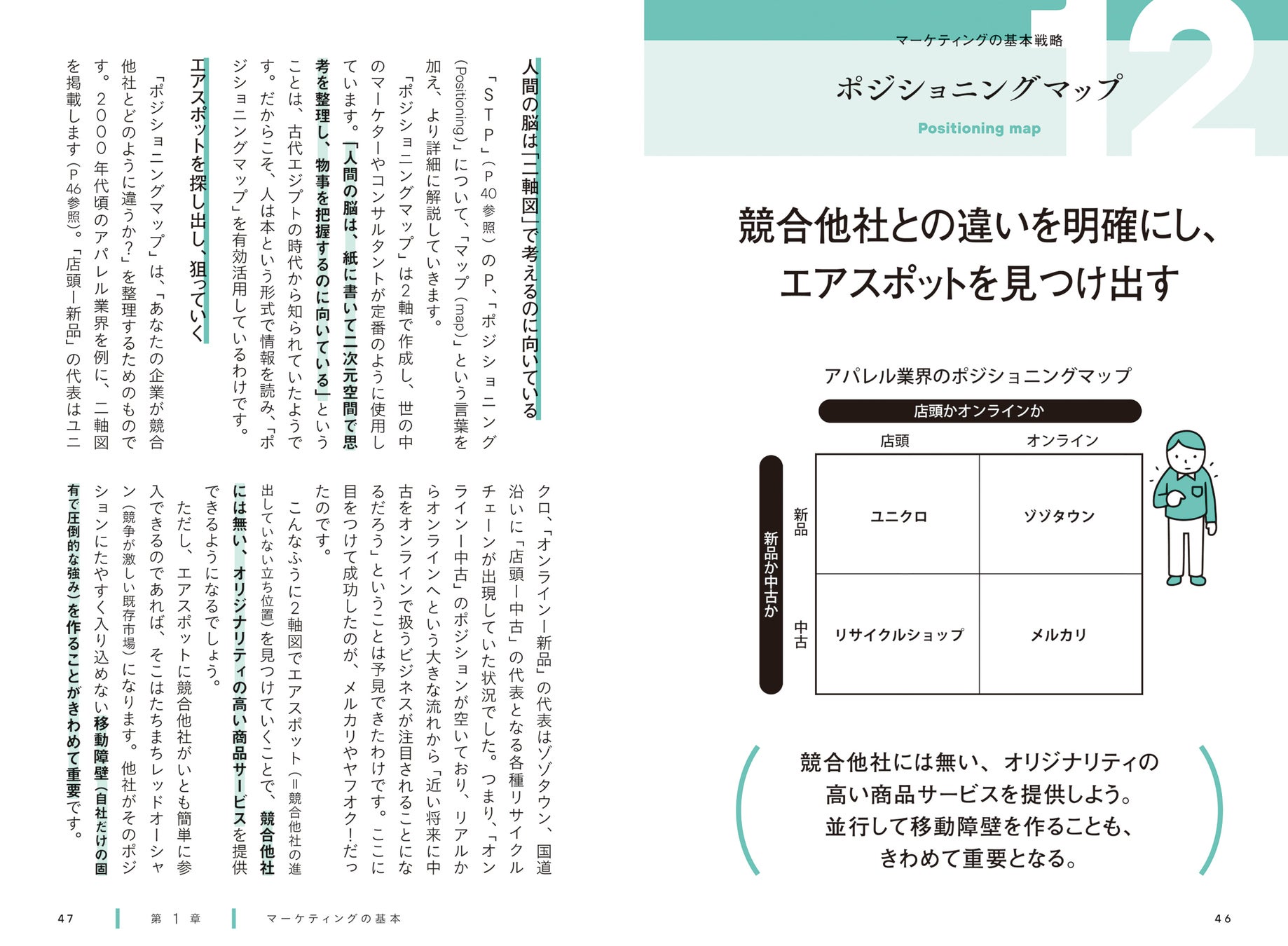 「マーケティングとは何か?」といった初歩から、市場分析、販売戦略、ブランディングまで、マーケティングの知識をイラストと図を用いてわかりやすく解説。右ページに見出しやイラスト、左ページはくわしい解説を掲載しているので、知りたい知識を簡潔に学ぶことができます。