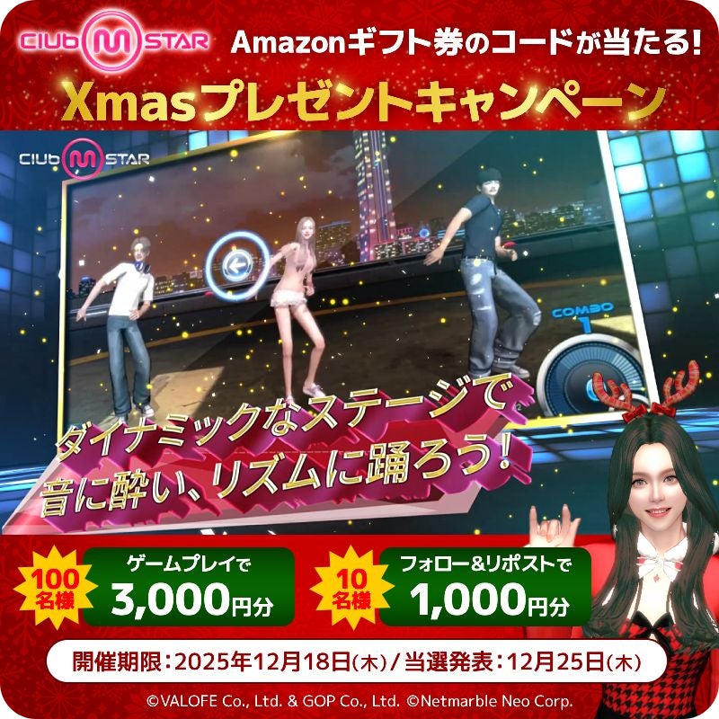 株式会社G・O・P[本社:東京都新宿区、代表取締役社長:申 載明(シン・ジェミョン)]は、PC向けオンラインダンスゲーム『Club M Star』(以下、クラブ・エム・スター)において、2025年11月20日(木)より「Xmasプレゼントキャンペーン」を開催します。
