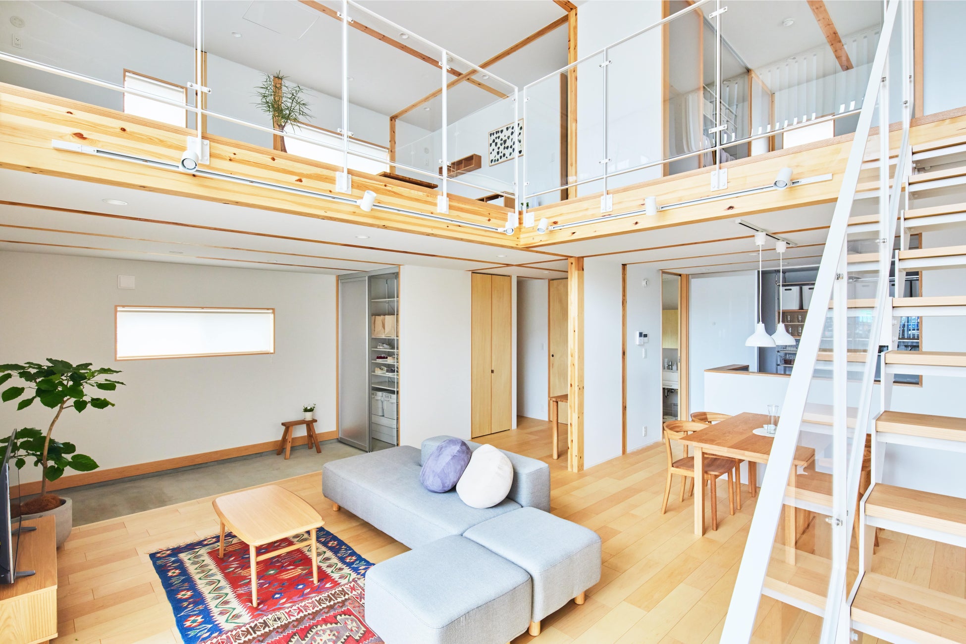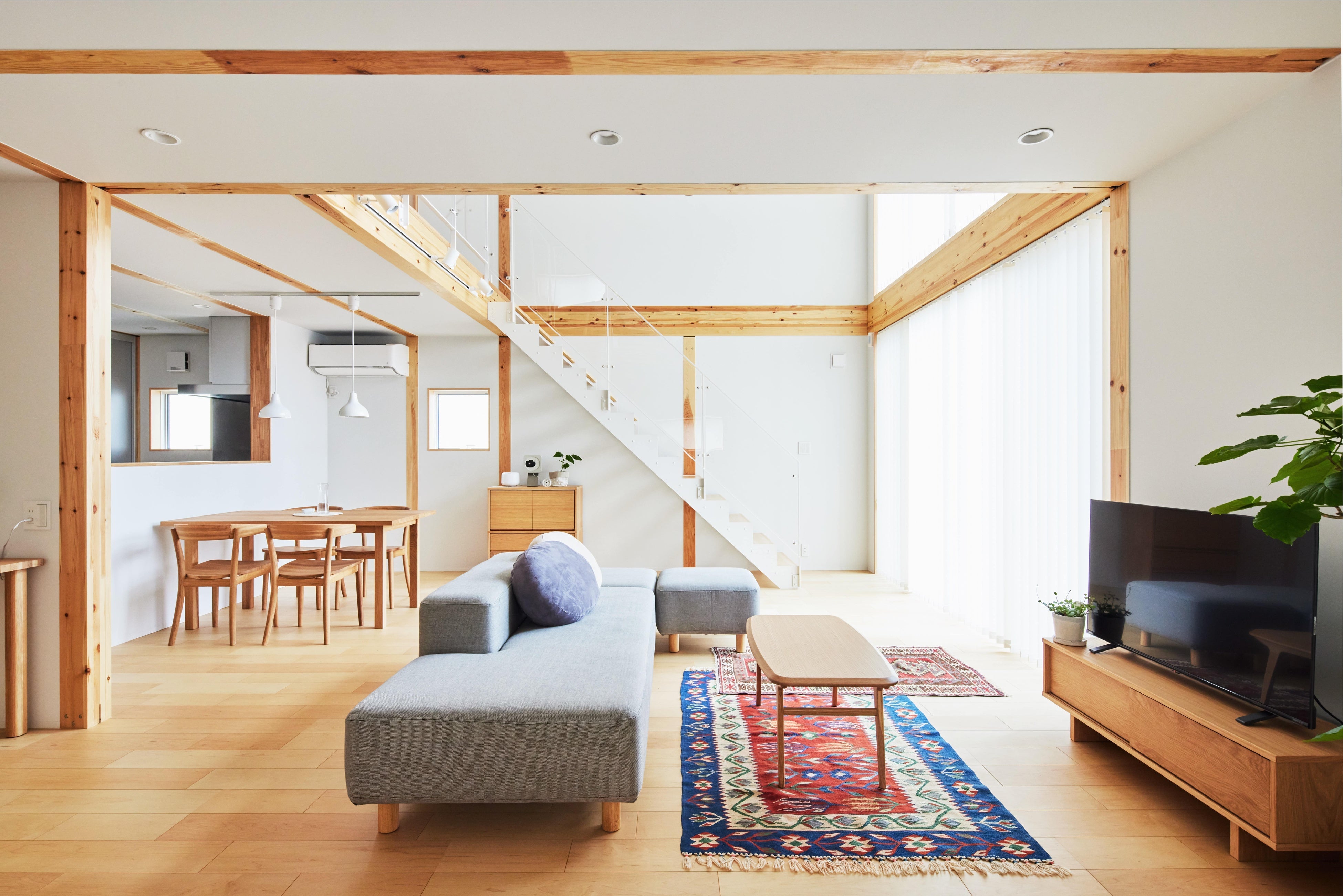 吹抜けがある開放的な一室空間で、住まい手が思うままに住まいを「編集」する。そんな自由な発想を木造住宅でかたちにした、「無印良品の家」第一弾が「木の家」です。強度が安定した構造用集成材によるSE構法を採用。大きな開口部と深い庇がある、箱のようなすっきりとした外観を持ち、太陽光と通風を最大限に活用する、環境負荷の少ない合理的な考えで設計されました。南向けの庇(ひさし)は、季節によって異なる日射を調整し、夏は直射日光を遮り、冬は温かな陽光を室内の奥まで導きます。温められた放射熱は、外断熱方式で外に逃がさず、少ないエネルギーで快適に暮らせる省エネ性能の高さも特長です。