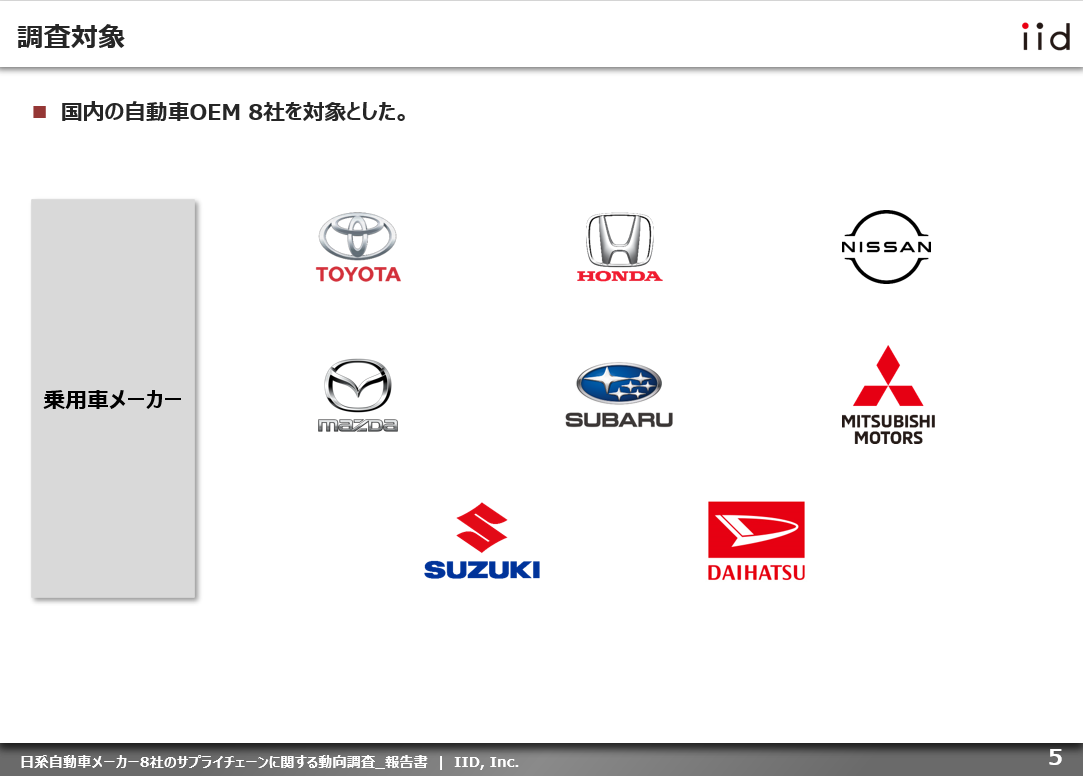 国内の自動車メーカー8社を対象に調査を行った。