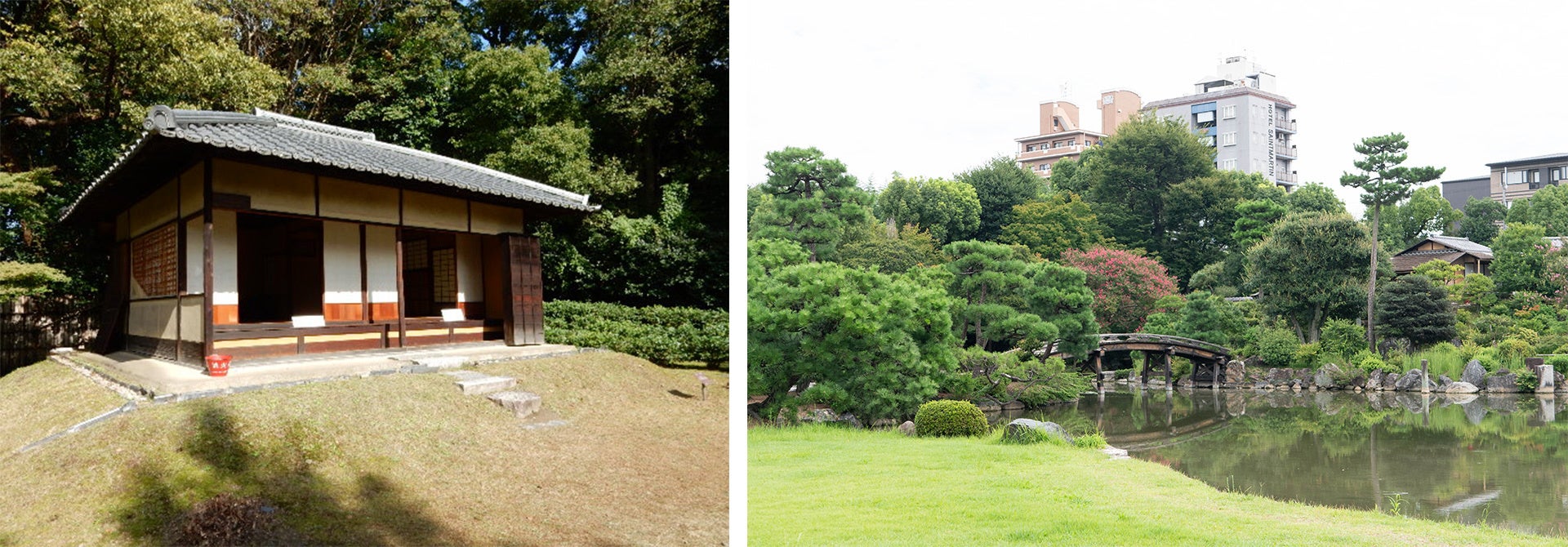 右)渉成園の庭園内には茶室などの建物が点在する名勝庭園。生物多様性に配慮した庭園管理が行われており、文化的にも生物学的にも豊かな場所。