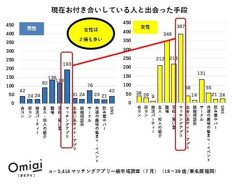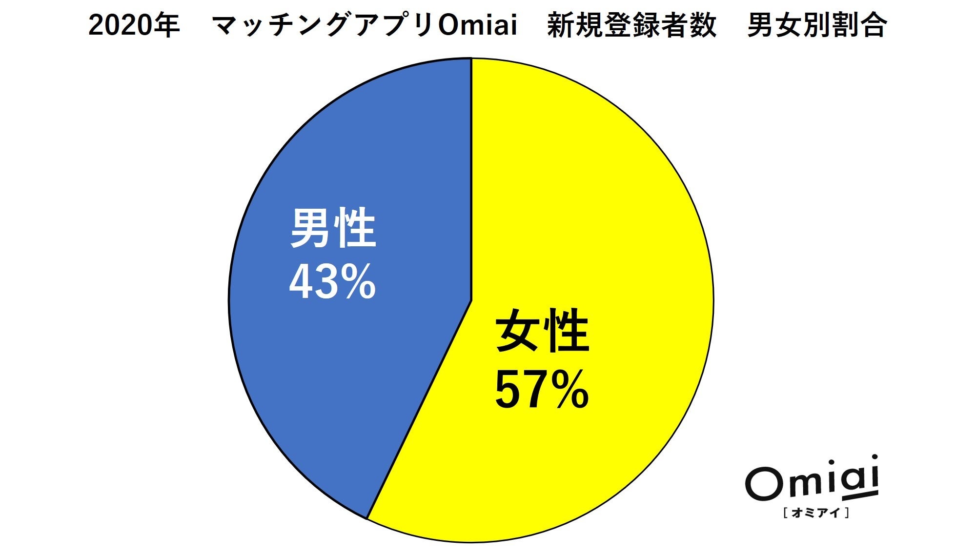 昨今の出会いが少ない状況下で、現在の彼氏彼女との出会いの手段を聞くと「マッチングアプリ」という回答が男女ともに1位に輝きました。また、この中でもマッチングアプリで彼氏ができたと答える女性の人数は男性の2倍という驚きの結果が。実際、Omiaiの新規登録者数を男女比で見ると確かに女性の方が多いというデータもあります。現在はマッチングアプリの利用が広く浸透し、リアルでの出会いが制限されたコロナ禍でも、特に女性はマッチングアプリを使って積極的に活動し、お相手を見つけている実態からも、スタンダードな出会いの手段として定着していると言えるでしょう。