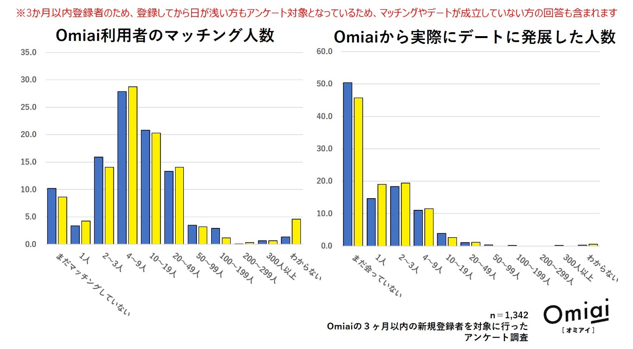 一方、男女ともに登録無料ですが、男性はお相手とやり取りする際には有料であることが多いマッチングアプリ。そんな背景から、「マッチングアプリに登録しても、どうせマッチングしないのでは?」、と不安に思う男性も多いと思います。しかし、Omiaiの3ヶ月以内の新規登録者を対象に行ったアンケート調査では、約9割がマッチング成立しており、実際にデートに至っている人数は2~3人が最も多いという結果も出ています。