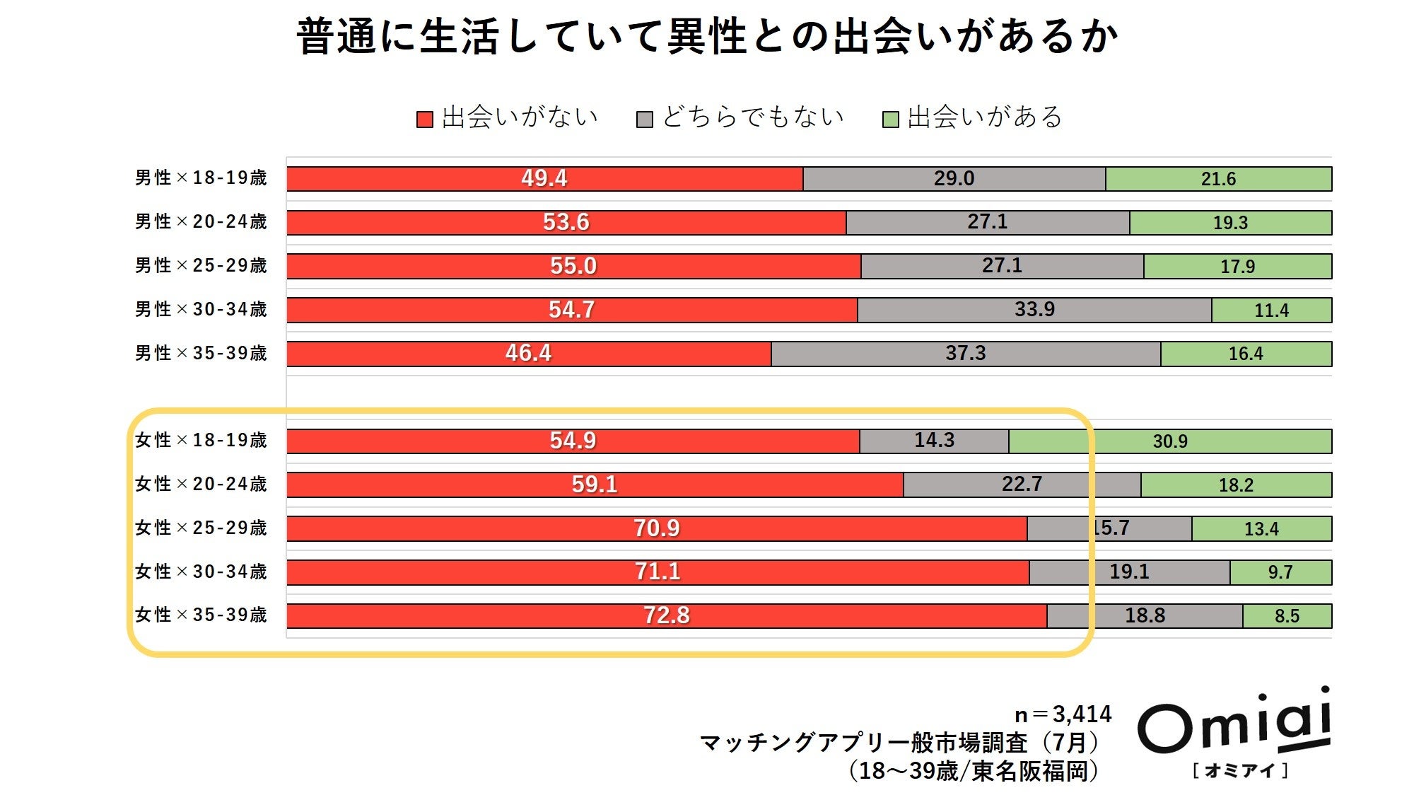 「普通に生活をしていて、異性との出会いがあるか」と聞いたところ、男女ともに全世代が「出会いがない」と回答。特に男女別でみると女性の方が、出会いがないと回答する比率が高いようです。