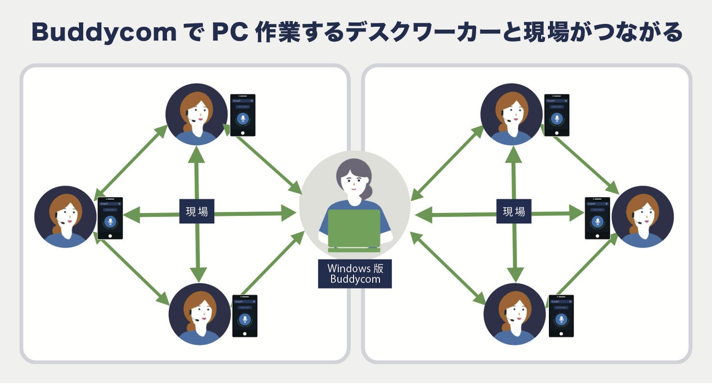 例えば、「工場内で交わされる現場作業員のやりとりを、本社オフィスやコントロールセンターでも把握したい」「航空、鉄道、バス、タクシーなどの運行スタッフのグループに対し、運行状況や整備状況を統括する指令センターからもコミュニケーションを取りたい」「警備会社で現場の警備にあたる警備員同士のやりとりを、コントロールセンターで把握したり、必要に応じて指示を出したい」などのニーズに対し、WindowsPC版Buddycomで、現場スタッフと簡単につながることができます。