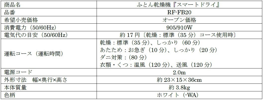 ふとん乾燥機『スマートドライ』 | RF-UA10 | オープン価格 | 2023年9月1日 |