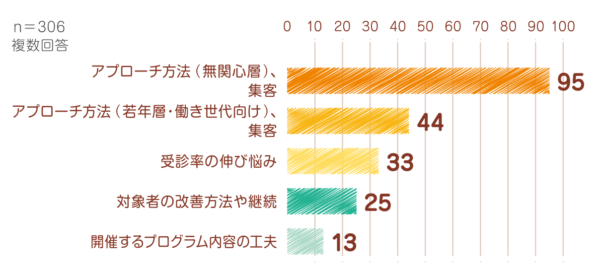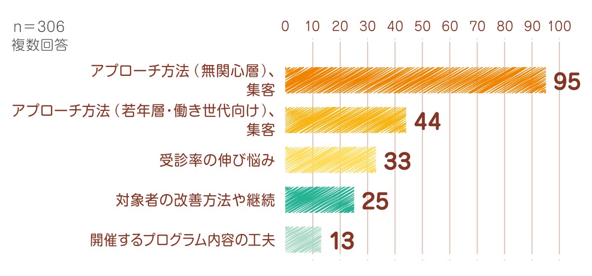 肥満症に関する疾患啓発活動において課題と感じていることは「アプローチ方法 (無関心層)、集客」が最多でした。また、「開催するプログラム内容の工夫」も課題として挙がりました。(上位5回答を掲載)