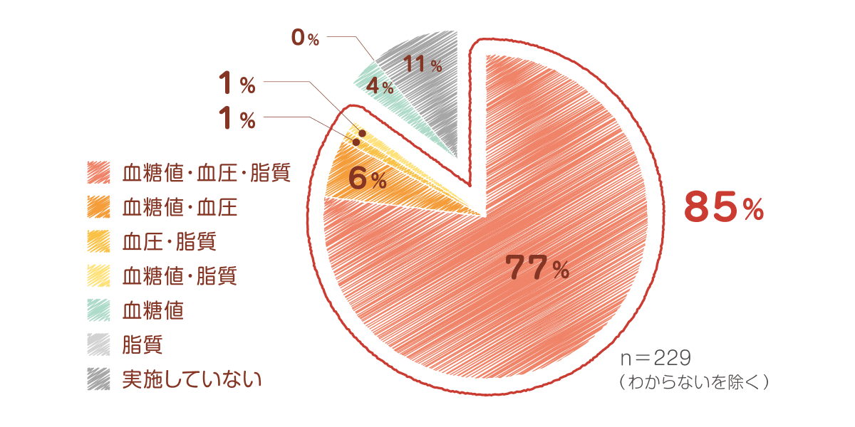 健診で、肥満症のリスク因子である血糖値・血圧・脂質に異常値があるにもかかわらず未受診である方への受診勧奨事業の現在の実施状況を尋ねたところ、「血糖値・血圧・脂質」のうち2つ以上の検査値について実施していると回答した自治体が85% (194自治体) でした。