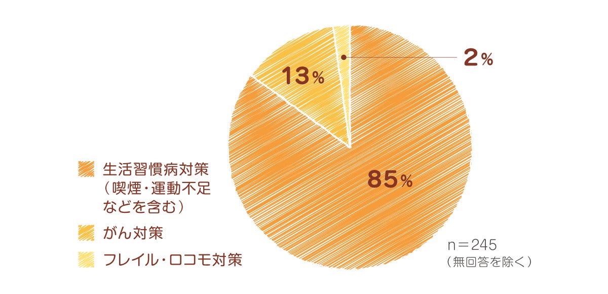 多くの自治体が次期策定計画において最優先として挙げた分野が肥満・糖尿病・循環器などの「生活習慣病対策」でした (85%)。次いで、がん対策やフレイル・ロコモ対策が挙がりました。
