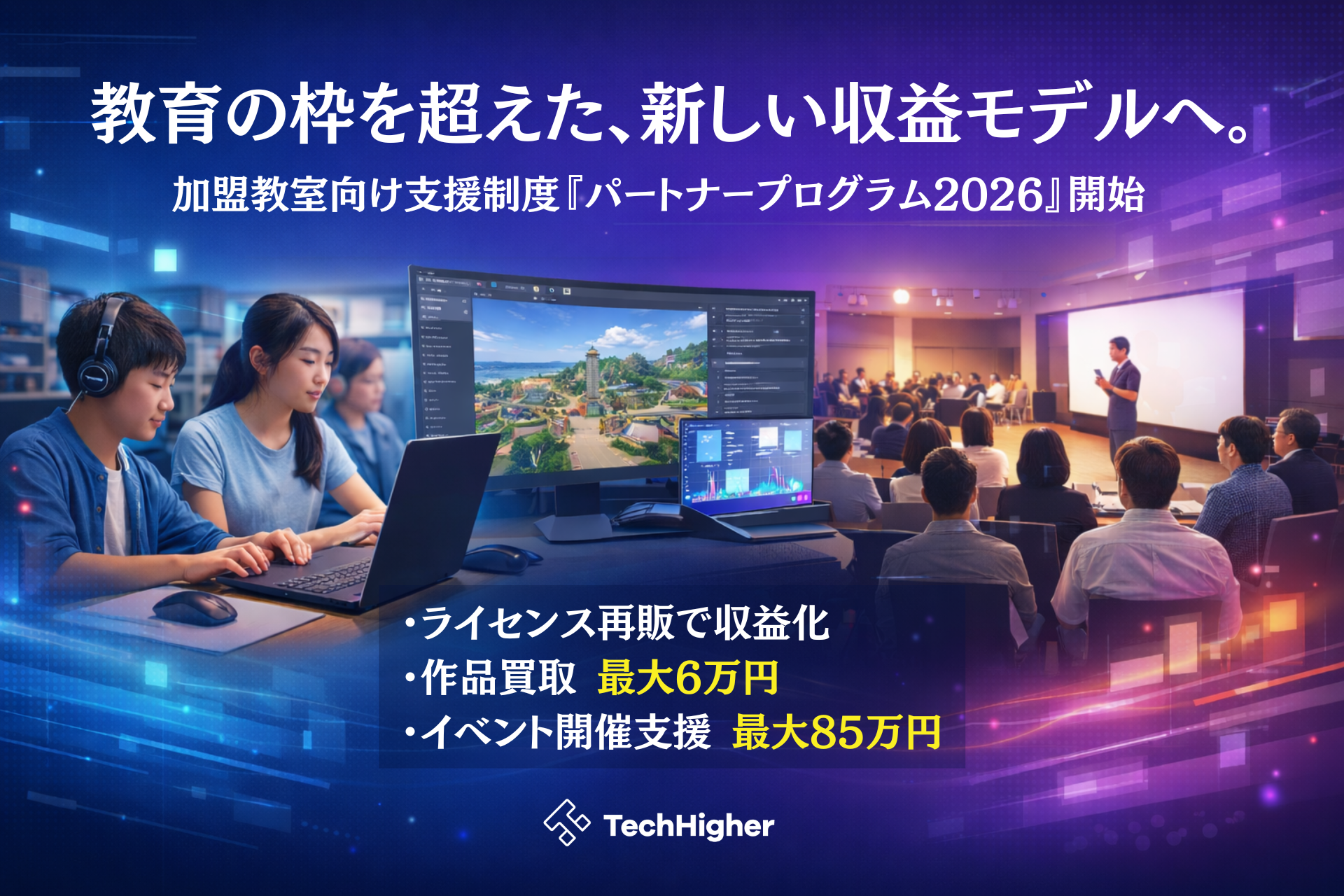10代向けデジタル人材育成サービス『TechHigher』を運営する株式会社エクシード(本社:東京都渋谷区、代表取締役:澤部愛子)は、2026年4月より、加盟教室向けに「パートナープログラム2026」を本格始動します。本プログラムは、プログラミング教室・放課後等デイサービスなど、教育・福祉現場の枠を超えてスキルやつながりを活かし、学びを軸とした新たな収益機会を提供する取り組みです。