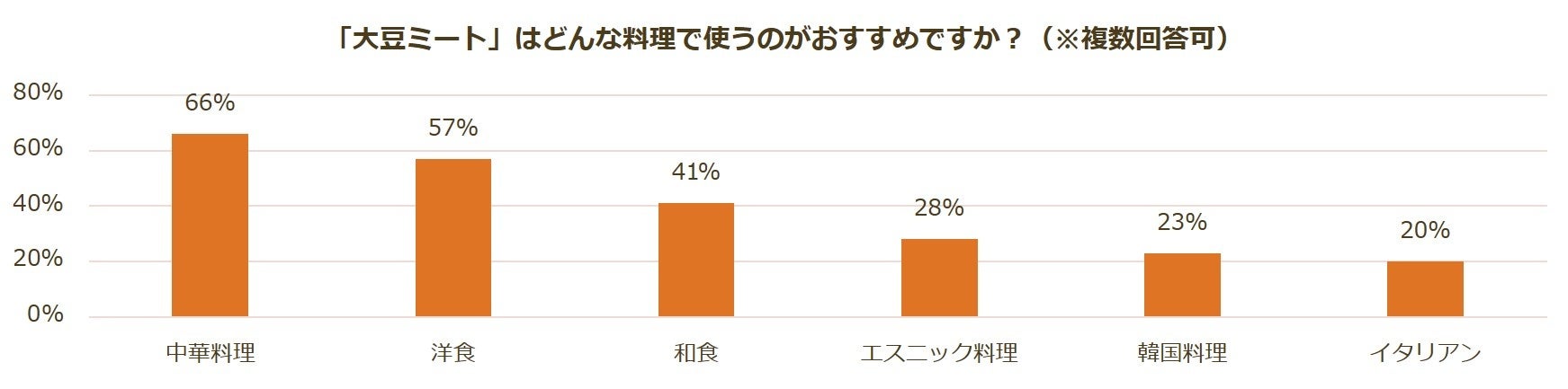 また、料理ジャンルでみてみると、「中華料理」が66%と最多となり、「洋食」(57%)、「和食」(41%)と、主要な和洋中で大豆ミートが活躍していることがわかります。選択肢以外でも「カレー」「ハンバーガー」「味の濃い料理」などのコメントが多く寄せられました。