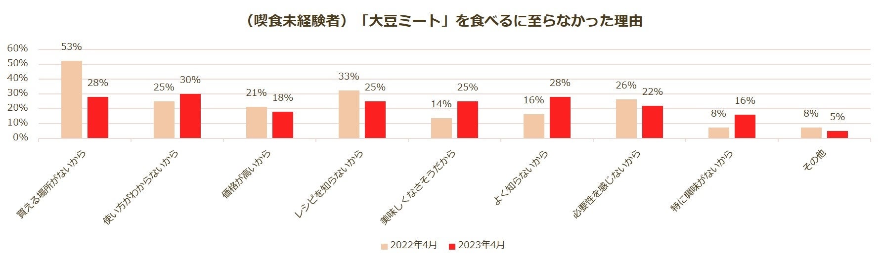 また、同じく継続取得している、大豆ミート喫食未経験者が食べるに至らなかった理由では、「買える場所がないから」が前年比▲25ptと激減しており、この1年での購買接点の大幅拡大が見て取れます。1年前は次点だった「使い方がわからないから」(30%)が逆転して最多となり、同水準で「よく知らないから」(28%)、「レシピを知らないから」(25%)、「美味しくなさそうだから」(25%)と続く結果となりました。大豆ミート市場拡大における次の課題は、使い方、レシピ、美味しい食べ方の浸透だと見ています。