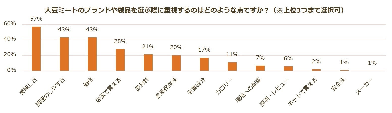 重視するのは「美味しさ」「調理しやすさ」「価格」。購買接点では「大豆ミート特設売場」ニーズが顕在化。未喫食者は特に「試食情報」重視の傾向。