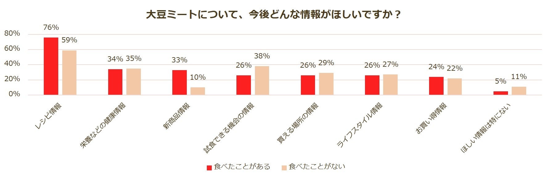 また、大豆ミートに関してほしい情報については、喫食経験者では、「レシピ情報」(76%)、「栄養などの健康情報」(34%)、「新商品情報」(33%)が上位となりました。一方で、喫食未経験者では「レシピ情報」(59%)が最多の点は同じながら、続くのは「試食できる機会の情報」(38%)、「栄養などの健康情報」(35%)と続き、新商品情報は10%にとどまり差が出る結果に。情報発信の際には、喫食経験の有無によって相手に適した情報を選んで届ける必要があるといえます。
