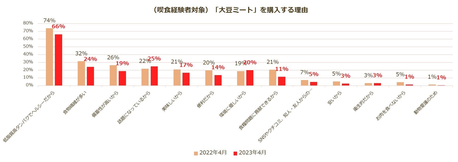 第1回調査時から継続取得している、「大豆ミートを購入する理由」では1年前と比較して「話題になっているから」(+3pt)、「環境にやさしいから」(+1pt)と増加が見られました。一方で、栄養面でのメリットや長期保存、調理の時短などの利便性は回答率が下がっており、大豆ミート普及には大豆ミートのもつ多様な価値をより強化して伝えていく必要があると捉えています。