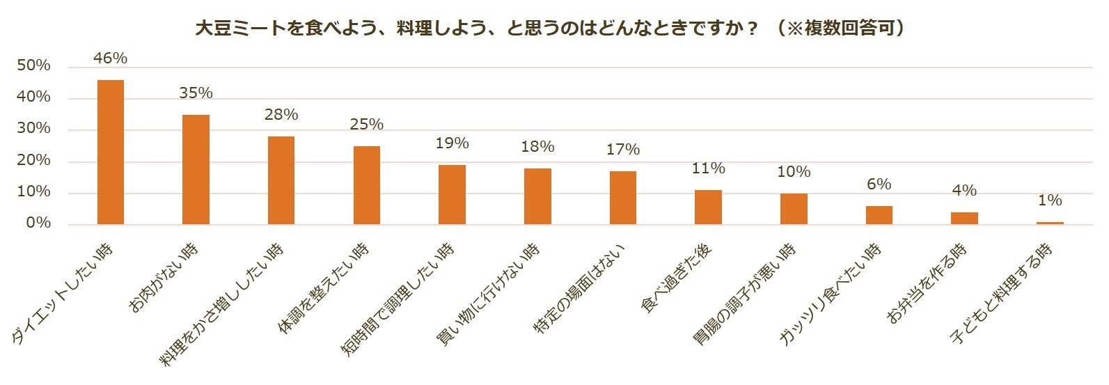 大豆ミートの喫食・調理シーンで多かったのは「ダイエット」(46%)、「肉がない時」(35%)、「料理のかさ増し」(28%)「体調を整えたい時」(25%)がいずれも25%超えと多く、新しい食品・大豆ミートの使いどころが定まってきていることがわかります。またそれ以外にも、調理の時短、ピンチの時のストック、身体をいたわりたい時など、大豆ミートの多様な活躍シーンが明らかになりました。