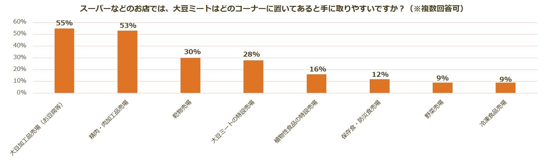 またスーパーなどの店頭で、どのコーナーに置いてあると手に取りやすいか、については、過半数が「大豆加工品売場」(55%)、「精肉・肉加工品売場」(53%)と回答。日常的にタンパク源を選ぶコーナーで手に取る選択肢に入れたい意向が強く現れました。ついで「乾物売場」(30%)、「大豆ミートの特設売場」(28%)が多く、まだあまり見かけない「大豆ミートの特設売場」のニーズが顕在化しつつあると見ています。