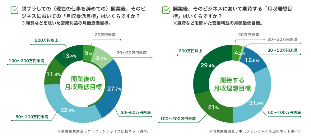 なお、「月収50~100万円未満」を年収換算すると「年収600万~1100万円」となり、40~50代の会社員のうち29.4%の少数派・高収入層にあたります。「200~600万円」の層が70.6%を占めていた現年収データと比較すると、脱サラ後は今以上に大きく稼ぎたいと考えている人が非常に多い結果となりました。