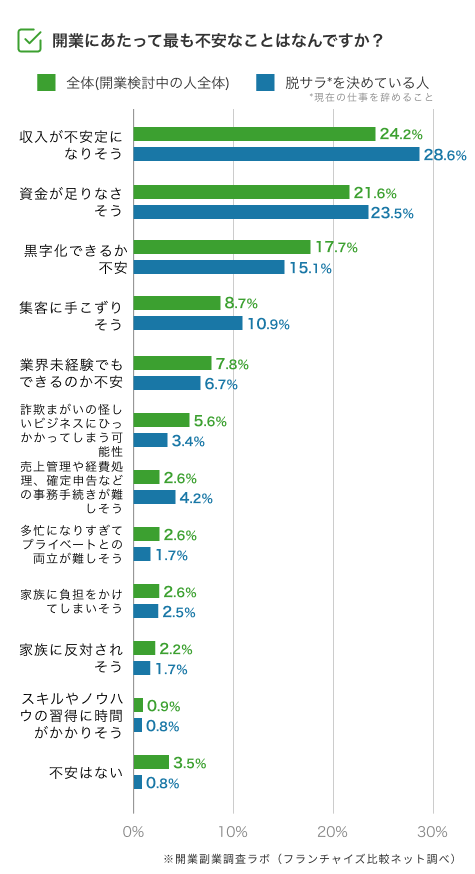 あわせて開業に対する不安な点を聞いたところ、収入や資金に関する項目に回答が集まり、脱サラ前提の人がより収入面に不安を感じていることが表れています。経験やスキル、ノウハウの不足、プライベートと両立できないかもしれないといった不安よりも、収入面とそれに紐づく黒字化・集客面における不安要素が大部分を占めることがわかりました。