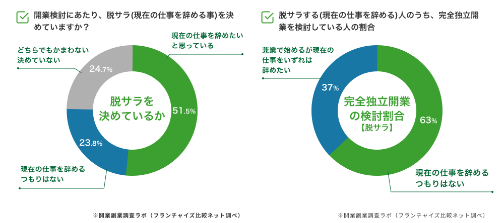 現在仕事をしながら開業を検討中の人を対象に、現職の継続意思について調査したところ「辞めたいと思っている」割合は51.5%と過半数を超えました。一方、「現在の仕事を辞めず兼業(副業)という形で開業を希望している」と「決めていない」割合はそれぞれ1/4程度。現在の仕事を辞めて脱サラを希望している人においては、「完全独立開業を検討」は63%、「兼業(副業)で始めるが現在の仕事をいずれは辞めたい」が37%となったため、現在の仕事をすぐに辞めて完全独立開業したい人、兼業(副業)の形で開業したい人の数はそれほど変わらないという結果になりました。