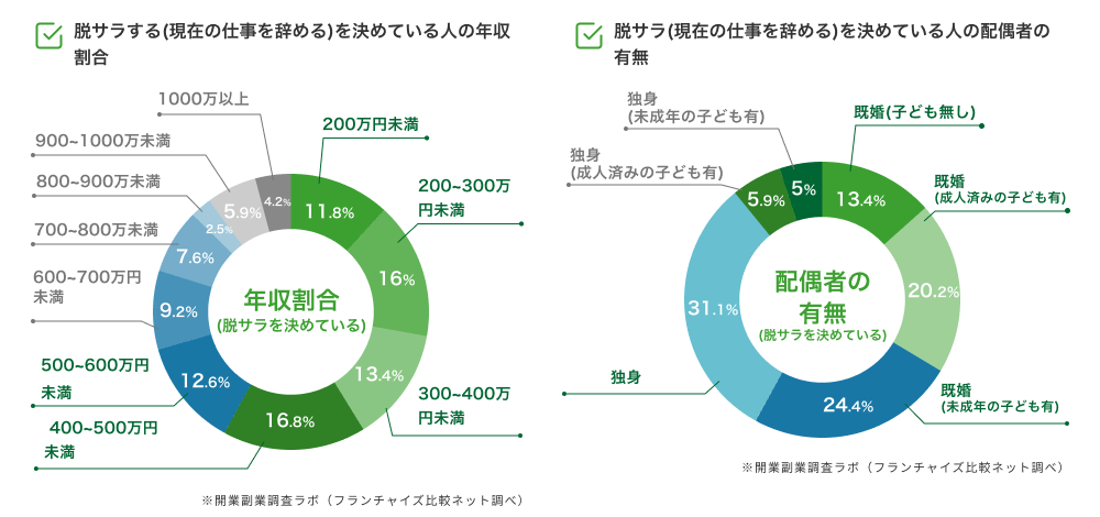 さらに、年収分布を見てみると、「400~500万円未満」が16.8%と最も多くなり、各年収帯の割合にばらつきはあるものの、「200万未満~600万円未満」の所得層合計は全体の70.6%を占めています。国税庁の民間給与実態統計調査※では、個人の平均年収は433万(男性532万円、女性293万円)となっていることから、ほぼ平均年収層が脱サラを希望していると読み取れます。なお、本アンケート調査回答者の配偶者や子ども有無に関する内訳は、「独身」が3割、「既婚者かつ子ども有」が4割強となっており、既婚・未婚や子どもの有無問わず脱サラを希望している人がいることがわかります。