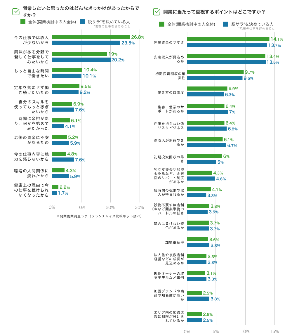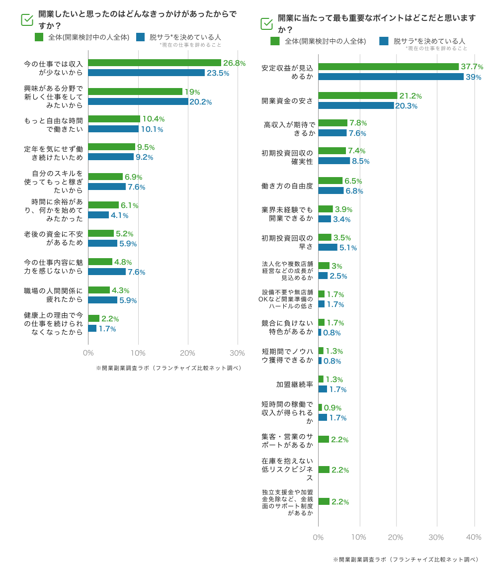 また、開業にあたり何を重視したいか尋ねたところ、開業検討者全体では「開業資金の安さ」が14.1%、次いで「安定収益が見込めるか」が13.4%という結果でした。開業検討者全体の数値と、脱サラを前提としている人を比較すると1位と2位に大きな違いははく、「初期投資回収の早さ・確実性」や「働き方の自由度」、「短時間の稼働で収入が得られるか」といった項目に脱サラ前提の人の票が集まっています。脱サラ=完全独立開業を想定し、より現実的に初期投資の回収可否や、自身の働きと収入の結びつきを慎重に検討していることが伺えます。