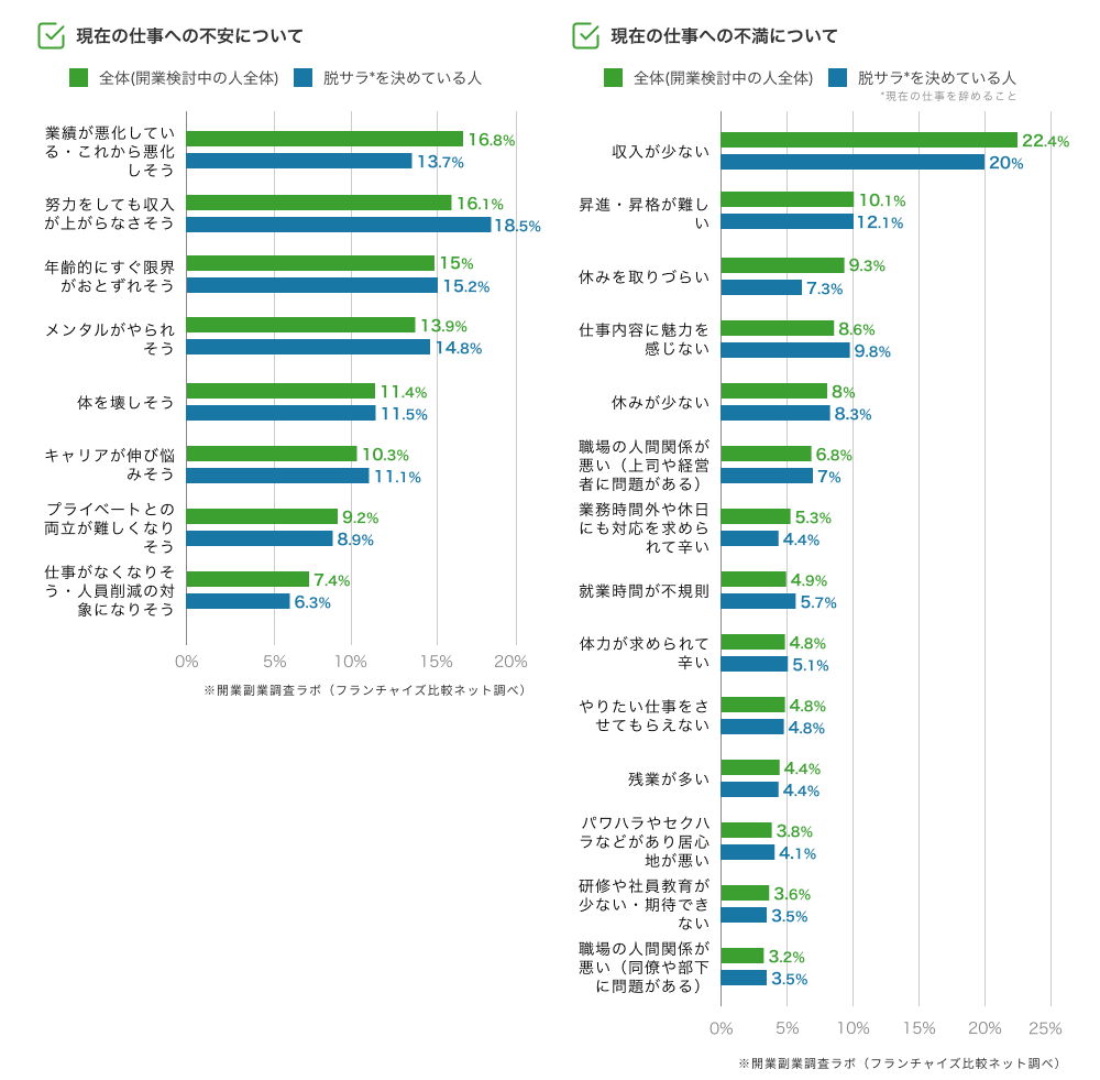 また、不満の要因に関しては、開業検討者全体と脱サラを決めている人ともに「収入が少ない」が不満要因となり、他項目に大きな差をつけています。後者の不満は、「昇進・昇格が難しい」、「仕事内容に魅力を感じない」、「休みが少ない」という3点が全体と比べて強い傾向にあることが特徴的です。これらの項目はいずれも個人の努力で簡単に改善しづらく外的要因に左右されるため、脱サラの意向が強くなることが考えられます。