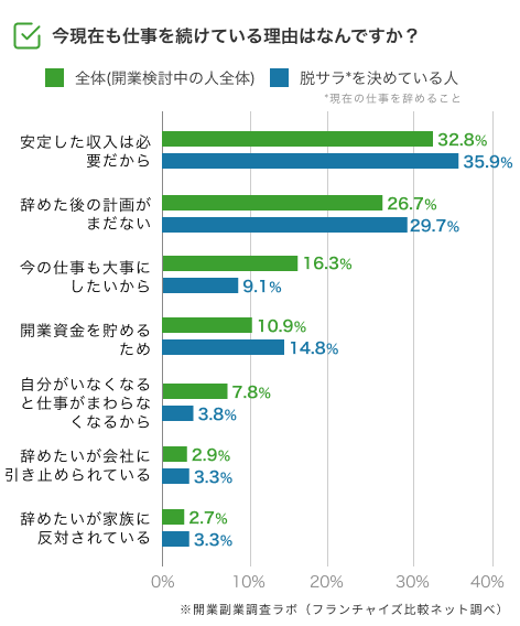 さらに、上記のような不安や不満が脱サラ検討のきっかけになっている中、それでも仕事を続けている理由を聞いてみたところ、現職で収入が限界とはいえ「安定収入がまだ必要だから」、「辞めた後の計画がまだない」という声が目立ちました。