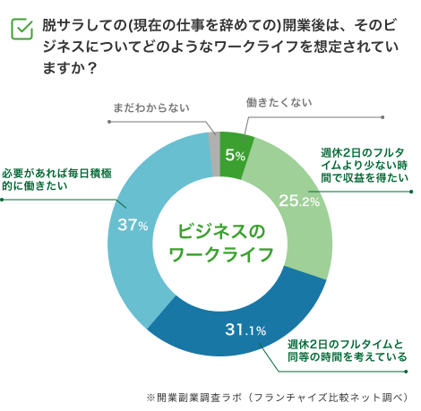 さらに、脱サラ後の働く時間数や頻度、休日とのバランスに関する調査結果では、全体の37%が「必要があれば毎日積極的に働きたい」という強い意欲を示していることがわかりました。「週休2日のフルタイムと同等で働く」という層と合わせると、7割弱が積極的に働きたいと答えています。脱サラ後は現職より楽に稼ぎたいというよりは、働けるだけ働き、労力と努力に見合う報酬を得ることを望む人が多いと読み取れます。