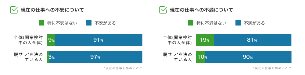 現在の仕事に対して不安・不満があるか、開業を検討している人全体と現在の仕事を辞めて脱サラを決めている人に調査したところ、ともに9割以上が現職に「不安がある」という結果になりました。現在の仕事へ「不満がある」割合も、それぞれ8~9割と高い数値に。また、微差ではあるものの、どちらも「不満」よりも「不安」が高い点も特徴です。脱サラを希望する中高年層は、仕事への「不満」よりも先々のキャリアや老後への「不安」を感じていることが浮かび上がりました。