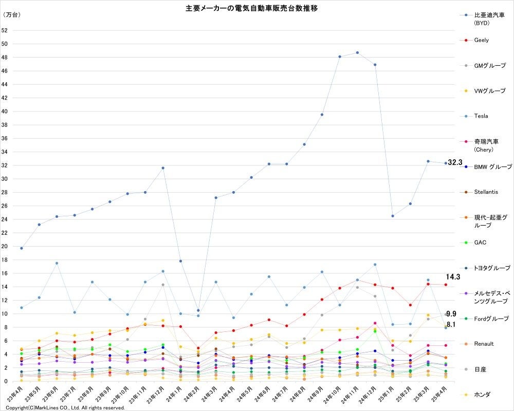 首位はBYDで前月から0.3万台減の32.3万台だった。2位のGeelyは前月から0.1万台の微減で14.3万台。GMグループは前月から0.7万台増の9.9万台で3位に浮上。4位はVWグループで前月から1.7万台減の8.1万台。Teslaは前月から7.1万台と大幅に減少し、7.9万台で5位だった。