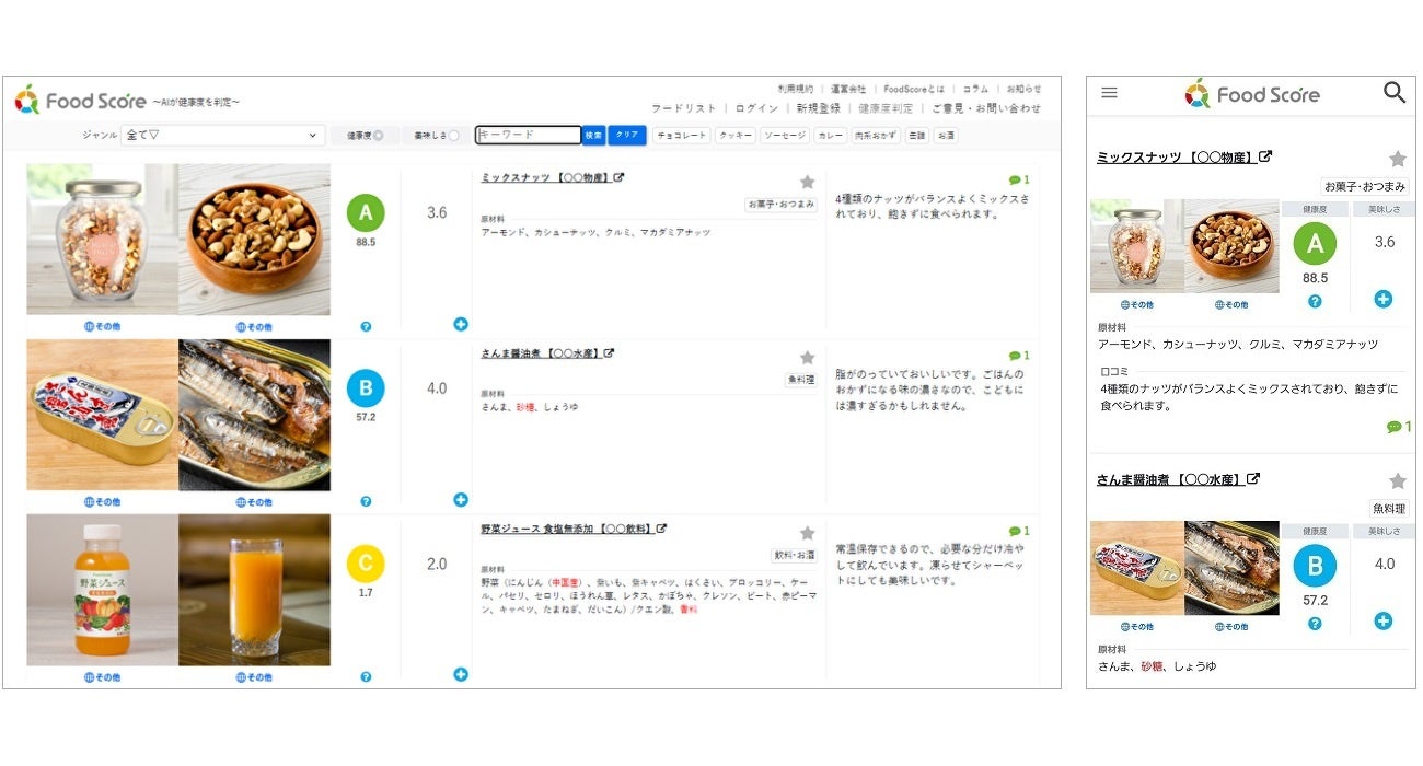 「FoodScore(フードスコア)」に投稿された商品は、AIによる独自指標の健康度とともに、投稿による美味しさの評価や口コミが「フードリスト」に表示されます。リリース後、健康度判定の精度や在庫状況表示の改善などユーザビリティの向上を図りました。健康度を判定済みで検索できる商品数は6万5000点を超えます(2022年2月現在)。またECサイトの購入リンクや在庫状況表示の他、気になる商品をお気に入り登録できるので、商品購入の参考や比較に活用できます。