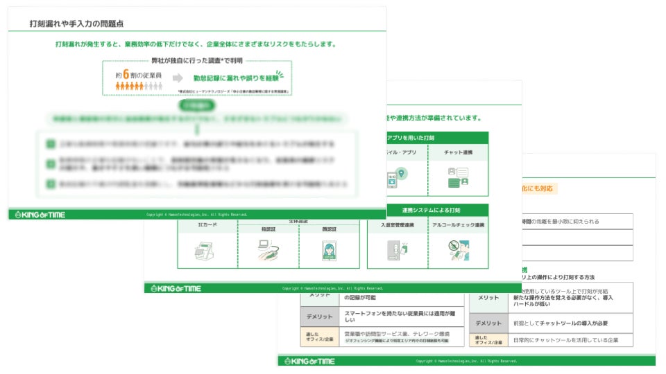 このような状況を受け、企業が働き方や環境に応じた最適な打刻方法を選定できるよう、勤怠管理システム導入時の盲点となりがちな「打刻方法選び」に特化した資料を作成いたしました。