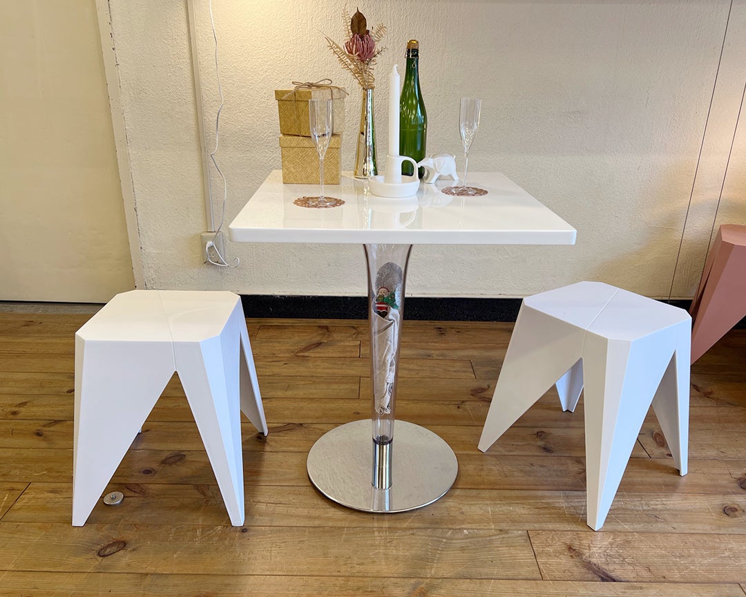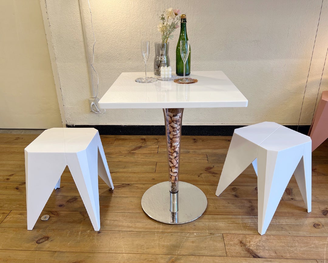 潔くテーブルもスツールもすべてホワイトでまとめて、よりシンプルさを追求したダイニングのコーディネートです。このコーディネートではワインのコルクの写真を入れていますが、クリアな脚に自分の趣味をアピールするのもこのダイニングテーブルの楽しみ方のひとつ。無機質な雰囲気にそっと好きなポイントを作れます。 カフェなどのお店でコーディネートする際には、そのお店の特長が表現できるアイテムを脚にいれて使うのもおすすめです。