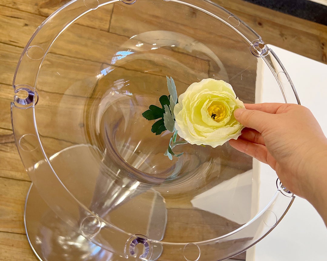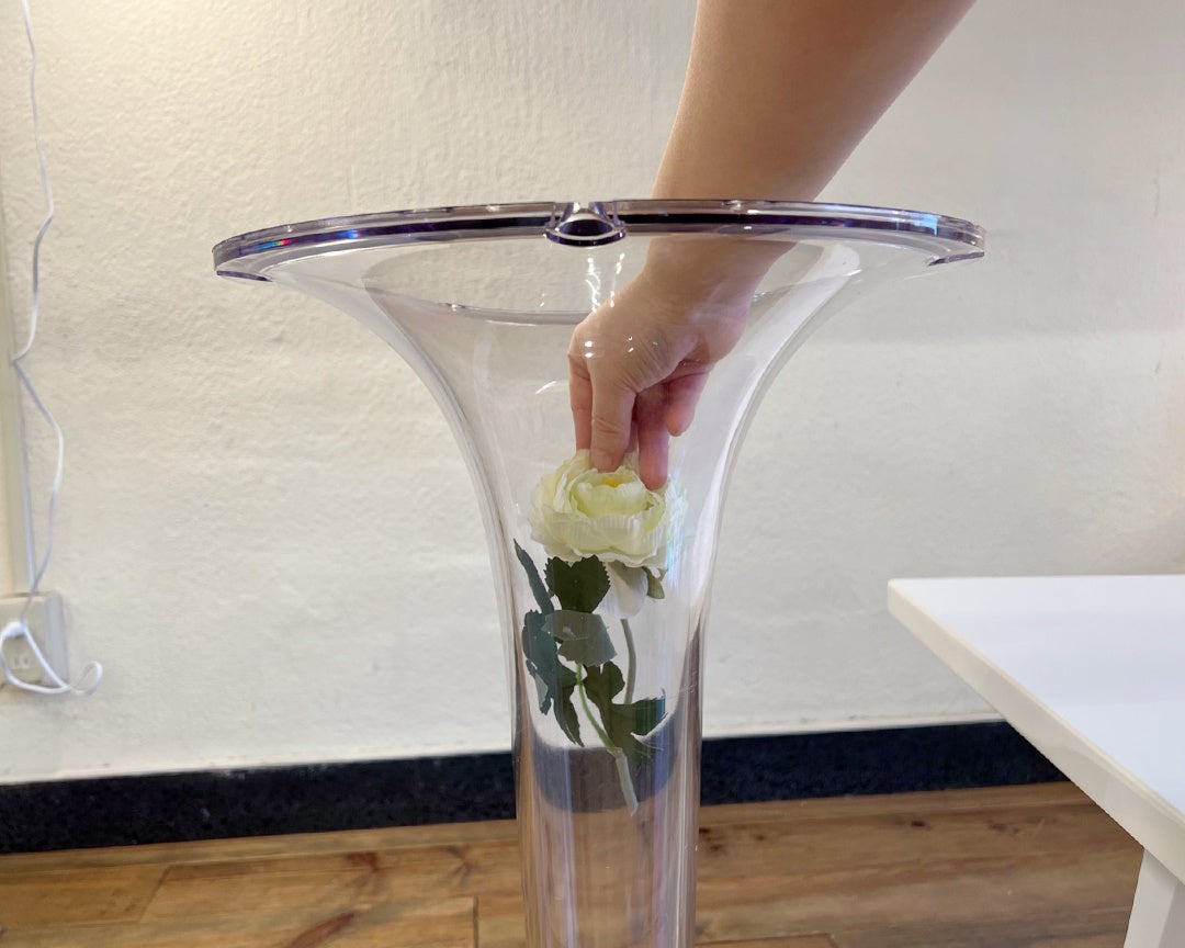 組立は天板と脚を取り付けるだけの簡単なもので、その際、脚に造花やドライフラワー、写真などを入れてディスプレイもお楽しみいただけます。天板はイタリアンモダンの象徴ともいえる鏡面仕上げとなっています。この手法はテーブルの天板やボード部分の家具によく使われ、高級家具の代名詞ともいわれています。脚の土台部分はクロムメッキ仕上げになっているので、脚の部分に入れたものを反射させて偶然生まれるアートを楽しむのもよいでしょう。