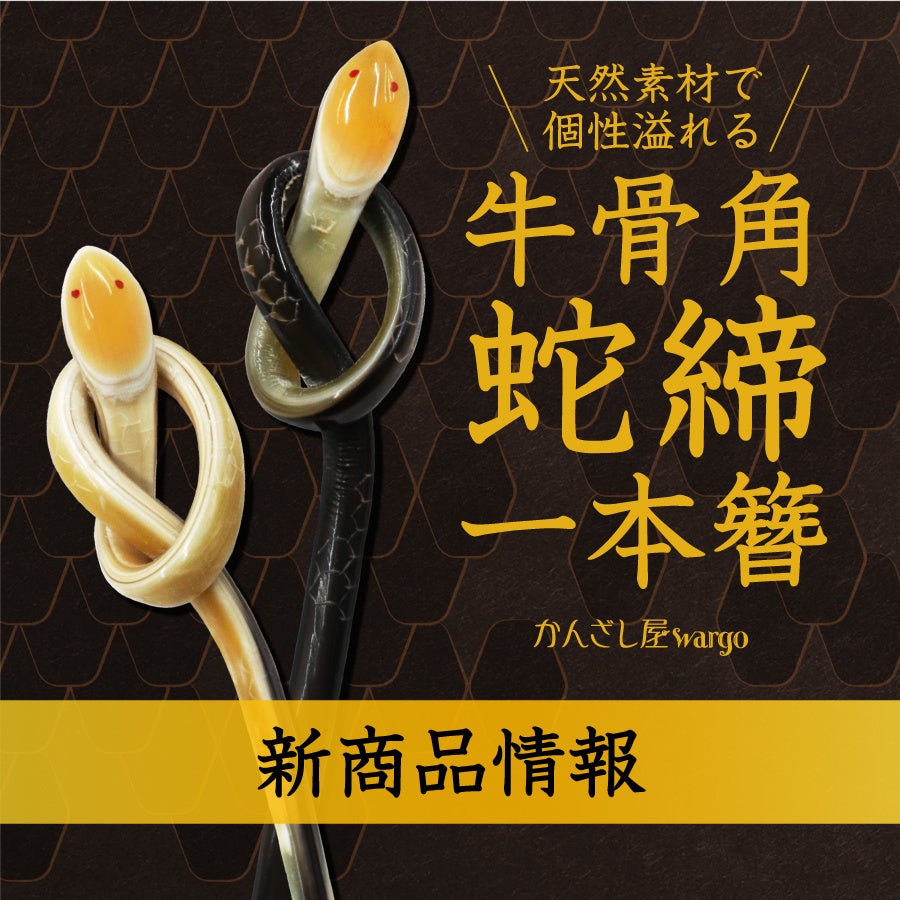 かんざし屋wargoより、天然素材の牛骨角を使用した新作「牛骨角蛇締一本簪」が、店舗限定で発売されました。この一本簪は、蛇が結びを作った形状をモチーフにデザインされており、和装に合わせたとき人目を惹きつつ、どこか上品さもある雰囲気が魅力。牛骨角は自然素材のため、ひとつひとつ色味や表情が異なり、自分だけの特別な一本を見つけることができます。