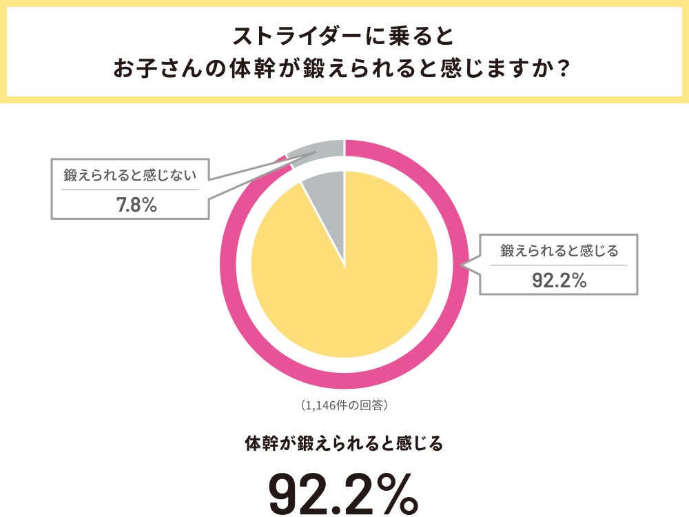 ストライダーに乗るとお子さんの体幹が鍛えられると感じると回答した方は92.2%にのぼり、足で地面を蹴って進み、下半身でバランスをとるストライダーに乗ることによって体幹が鍛えられるということがうかがえる結果となりました。