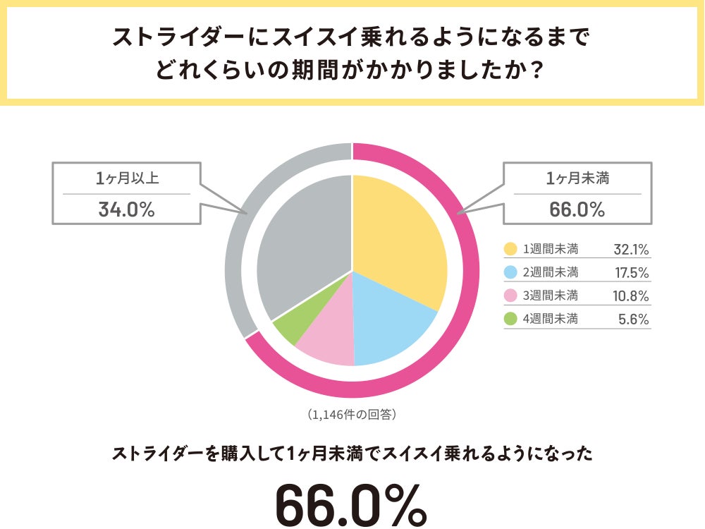 Q1.ストライダーを購入して1ヶ月未満でスイスイ乗れるようになったと回答した方が66.0%