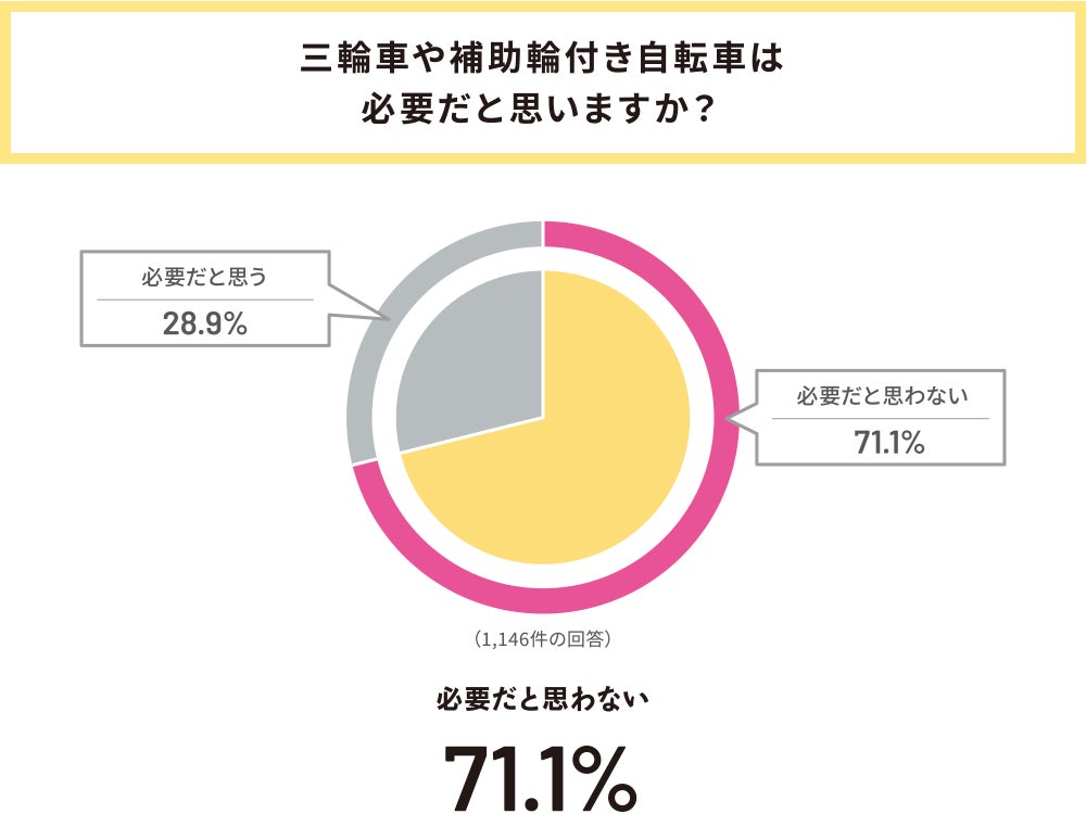 三輪車や補助輪付き自転車は必要だと思わないと回答した方は71.1%にのぼり、一度ストライダーに乗って遊ぶと、三輪車や補助輪付き自転車では得られないスピード感を体感でき、自転車デビューまでずっと乗り続けられるため、他の乗用玩具が必要なくなるということがうかがえる結果となりました。